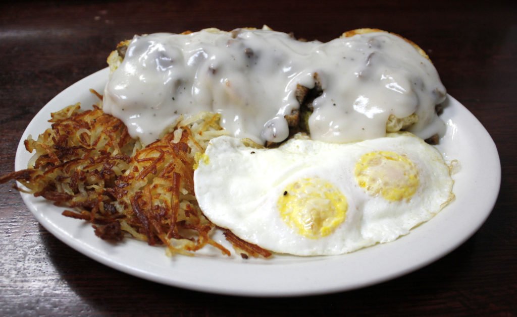 Fluffy biscuits and sausage gravy (pork or turkey)