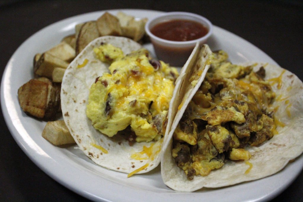 2 eggs, salsa & cheese on corn or flour tortillas, served with hashbrowns or fried potatoes & refried beans