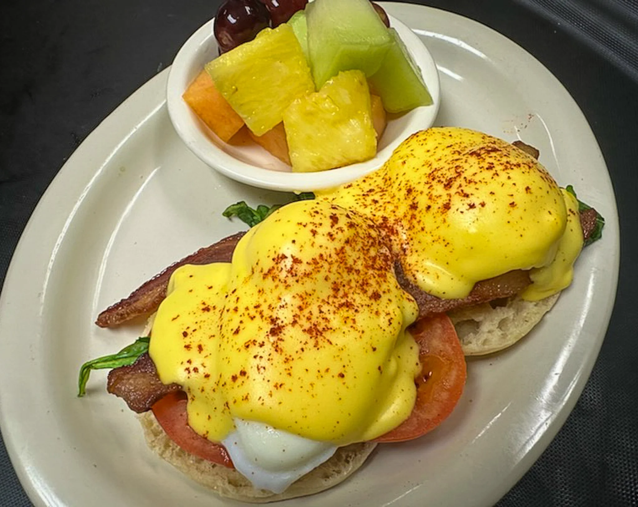Canadian style bacon, 2 poached eggs & Hollandaise on a toasted English muffin