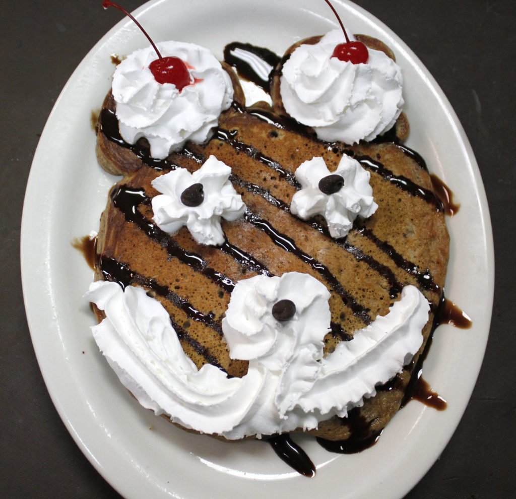 Chocolate pancake with whipped cream ears, cherry ears & chocolate syrup